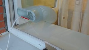 Установка мобильного кондиционераУстановку мобильного кондиционера можно произвести самому без помощи монтажной организации. Для этого нужно поместить сам моноблок ближе к окну охлаждаемой комнаты, а гофру для отвода отработанного тепла высунуть в окно, но для нормальной работы кондиционера, окно должно быть закрытое. В этом случае в оконный проем на период летнего зноя вставляется орг стекло с вырезанным в нем отверстием под гофрированную трубу для отвода тепла. Эта и есть самая большая трудность установки.